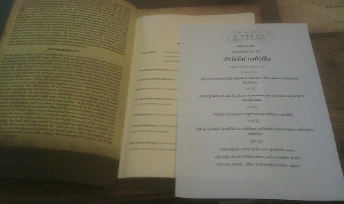 já - Jídelní lístek byly papírové listy ve složkách v deskách s nějakým umělohmotným polstrováním. Listy uvnitř byly držené nějakým gumovým provázkem, takže nejdřív se první strany tvářily, že je budu muset držet, abych se koukal na další, ale pak už v úchytném systému něco přeskočilo a dalo se listovat normálně. Celkově dělal lístek trochu humpolácký dojem. A přestože bylo vše čitelné, byl lístek kvůli zbytečnému listování méně přehledný. Jedna zalaminovaná A4 by byla lepší.
