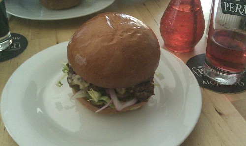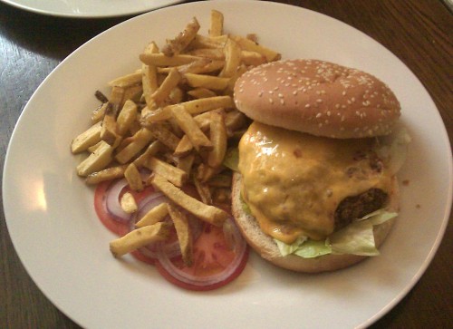 já - Objednali jsme si klasický hamburger s cheddarem, obsahoval i trochu ledového salátu. Talíř obsahoval i velkou porci domácích hranolků, a tři tenká kolečka rajčete a cibule. Hranolky mne nenadchly, mám rád suché a křupavé, ale tyhle byly celkem málo udělané, skoro vařené. Hamburger byl v krásně velké housce sypané sezamem, chuť housky jsem neregistroval, byla průměrná, konzistence i čerstvost výborná. Burger samotný byl udělaný medium, jak bylo na jídelním lístku uvedeno. Celkově byl hamburger dobrý, ale proti jiným, které jsem ochutnával za poslední dobu, obsahoval málo chutí. Aspoň slaninu by mohli doplnit.