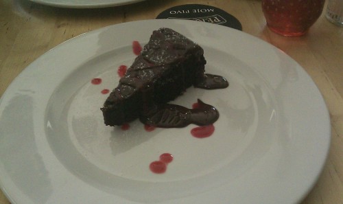 já - Tentokrát jsme toho měli víc než normálně - dvě hlavní jídla, tři nápoje a dva zákusky. Sodovka s citronem za 36Kč, Shake po 52Kč, Noky s lososem na 160Kč, Kachní stehno za 230Kč a zákusky po 60Kč. Ještě nám byl naúčtován couvert po 12Kč za osobu, opět mi to připadá trapné, radši bych jim nechal o něco vyšší spropitné, takhle mne naštvali. Celkově jsem za dva lidi platil 700Kč, což není úplně málo, ale když vezmu v úvahu, že jsme oba odcházeli úplně najedení, nestěžuju si.