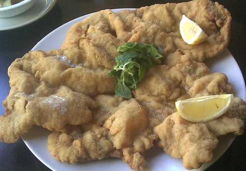 já - K pití jsem si dal Almdudler, jeden z mých nejoblíbenějších nápojů vůbec. Jsem rád, že je někde v Čechách k sehnání. Šel jsem na jistotu na řízek, kamarád ještě po cestě uvažoval, co si dá, ale nakonec si dal taky řízek. Jedná se o pravý vídeňský řízek, takže telecí. Přistály před námi velké talíře plné řízků, jednalo se o tři řízky zvící sloních uší. Vedle takového talíře i miska germánského bramborového salátu (plátky vařených brambor, cibulka, kyselý nálev) vypadala maličkatá. Kdybych místo tří řízků dostal řízek jediný, nic bych neřekl a užil bych si oběda, trojitá borce byla trochu overkill. Řízek samotný byl výborný, maso vyklepané do tenoučka, ale zachovalo si svou šťavnatost a bylo krásně měkké. Neměl jsem šanci porci sníst, tak jsem ještě jeden a půl řízku dostal zabaleno s sebou.