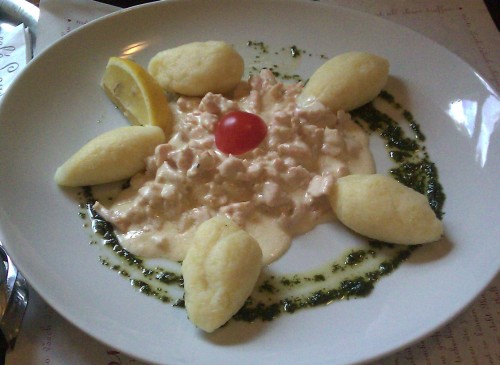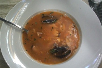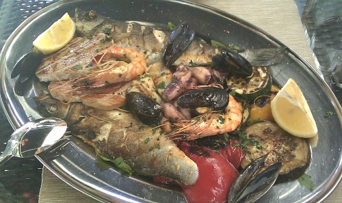 já - Přišel jsem připraven na absolutní improvizaci s jídly, jelikož jsem očekával cizokrajná jídla. Po přečtení jídeláku jsem zjistil, že mi paměť po asi měsíci podávala zbytečně zmatené informace, jelikož se jednalo o úplně typickou středomořskou (řekl bych italskou) kuchyni. Mám opravdu rád rybí polévky, tak její volba byla jasná. Pak jsem neměl jasno v hlavním chodu, chtěl jsem něco s mořskými plody, tak jsem rozhodoval mezi těstovinami, rizotem nebo mořskými plody na grilu. Nakonec jsme spolu zvolili Jadranský talíř s grilovanými mořskými plody, údajně pro dvě osoby, ještě jsme si k tomu dali jednu grilovanou zeleninu. Polévka byla výborná, plná mušlí a rybího masa. Dostali jsme k ní 5 malých domácích ciabat, které byly skutečně dobré, což udělalo z polévky skoro hlavní chod. Talíř pro dva s grilovanými mořskými plody a zeleninou už na první pohled nebyl moc velký. Z mořských plodů obsahoval 6 slávek, které po ogrilování byly mrňavé, několik kousků malých olihní, jednu rybu rozkrojenou podél páteře napůl, dva plátky rybího masa, které jsme nedokázali identifikovat, a dvě napůl oloupané středně velké krevety. Z grilované zeleniny jsme pak měli dvě kolečka cukíny, jedno kolečko lilku, kus papriky červené a kus papriky žluté. Cukína jako vždy nuda, lilek mi celkem chutnal, papriky byly málo udělané a tvrdší. Neidentifikovatelné plátky ryb byly suché, půlená ryba byla v pořádku, ale nudná, slávky obsahovaly mikroskopické maso, olihně byly dobré, krevety pak nádherně voněly a byly absolutně výborné. Celkově hlavní jídlo bylo hodně malé, rozhodně bych ho bez problémů snědl sám. Měl jsem tedy pak ještě chuť si dát něco dalšího, ale číšník nás nechal tak dlouho po dojedení čekat, že jsem ztratil náladu jim tam ještě něco utrácet.