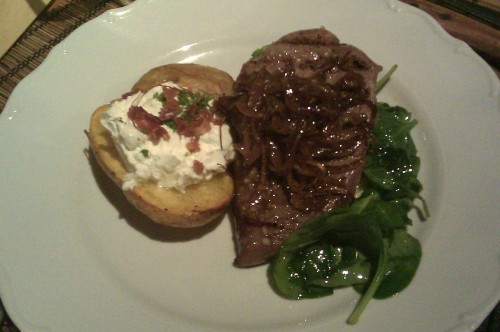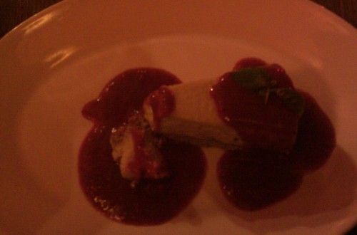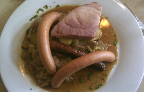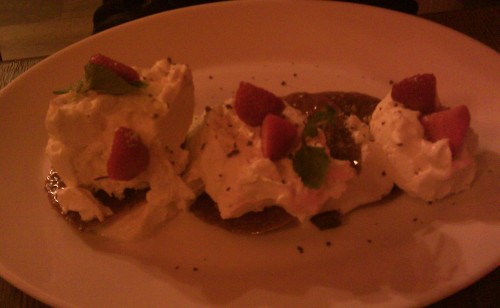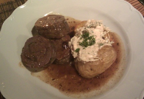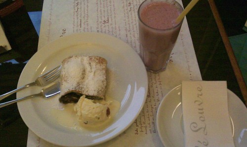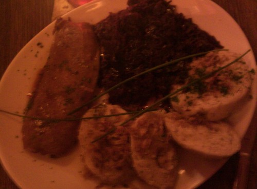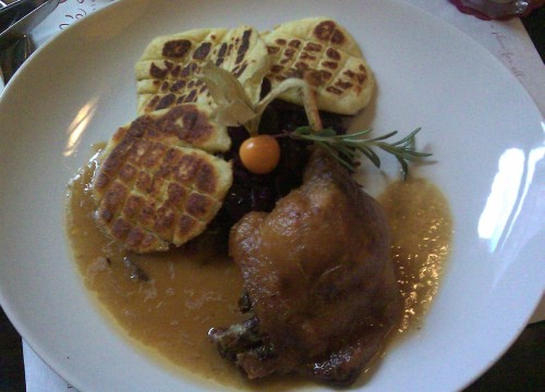 já - Kamarádka si vybrala Domácí bramborové noky s lososem, bazalkovým pestem a smetanou. Já jsem si po dlouhém výběru mezi Konfitovanou kachnou, Hamburgerem, Gulášem a Biftekem vybral kachnu. Jednalo se o konfitované kachní stehno, takže porce nebyla tak obrovská, jako když někde nabízí čtvrt nebo dokonce půl kachny. Zajímavá byla tím, že červené zelí obsahovalo mandarinky. Byly evidentně z konzervy kompotu a nezdálo se mi, že by nějak změnily chuť zelí, spíš to byly mandarinky, co chutnaly jak červené zelí, takže sice zajímavé, ale úplně zbytečné. Zelí bylo na můj vkus trochu kyselejší. Zajímavější byly bramborové placičky, které byly krásně jemné, jen jich bylo celkem málo, kdyby místo tří jich bylo pět, bylo by to vyváženější. Samotná kachna byla výborná s krásnou křupavou kůrčičkou. K pití jsem si dal jahodový shake, který byl v jídelním lístku tak schovaný, že jsem si ho všimnul na poslední chvíli, byl výborný. Po hlavním jídle jsem ještě měl chuť na zákusek, jichž mají v nabídce nadprůměrné množství. Dal jsem si švestkový štrúdl s mákem a vanilkovou zmrzlinou, chuťově průměr, švestky byly trochu tvrdší, celkově měl být sladší, zmrzlina se mi k tomu nehodila. Kamarádka si dala Schwarzwaldský dort, který byl rozhodně lepší, pěkně domácí šlehačka, měkký kakaový korpus a třešně. Za zmínku ještě stojí předkrm, který jsme dostali bez vyžádání, v podobě košíku s několika druhy chlebů a malým kalíškem bylinkového másla. Chleby byly oschlé, takže nijak nepotěšily, spíš naopak.