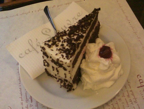 já - Název Savoy je mi dobře známý u hotelu, ale o podniku Café Savoy jsem nevěděl do chvíle, než jsem hledal poslední oběť našeho testu restaurací. Zvenku je podnik nenápadný, uvnitř střídmý až nudný do chvíle než uvidíte dvě stěny pokryté vinnou policí. V restauraci se mi ohromně líbilo, že vídáte různé dezerty, které si můžete objednat ke stolu. Stačí si zapamatovat číslo, které u sebe má napsané.
