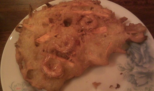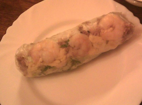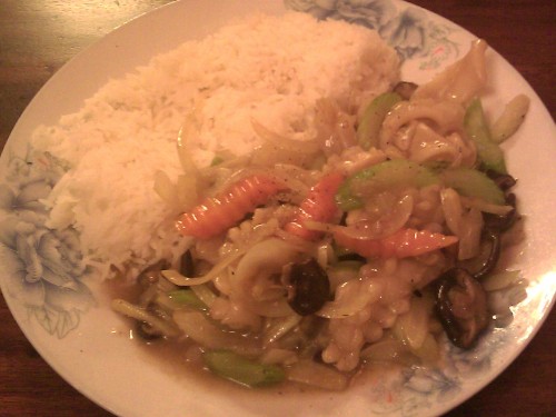 já - Chtěl jsem toho ochutnat co nejvíc, ale kamarád mne naštěstí trochu zbrzdil, takže jsem vynechal polévku, které, jak jsem si u vedlejšího stolu všimnul, byl pěkný kotel. Dal jsem si tedy dva předkrmy a jedno hlavní jídlo. Pití prodávají v na restauraci netradičně půllitrových PETkách a dostanete skleničku. Můj první předkrm byl čerstvý jarní závitek (asi hodně z vás zná smažený z čínských restaurací), do tvaru válečku do rýžového papíru balených několik součástí - zelenina (nějaký salát nebo zelí), rýže, krevety a nějaké asi smažené mleté maso (to v malém množství). K závitku jsem dostal kalíšek čiré tekutiny s paprikovými semínky uvnitř, dodával závitku mírně ostrou chuť a závitek byl pak šťavnatější. Celkově mi závitek velmi chutnal a mám pocit, že musí být velmi zdravý. Druhým předkrmem byla smažená placka ze sladkých brambor s proužky mrkve uvnitř. Placka byla mastnější, tužší a taky dodávaná s kalíškem peprné vody, na placce ležely tři osmažené malé krevety. Chuť byla dobrá, ale kvůli mastnotě a trochu tužší konzistenci úplně unešený nejsem. Mým hlavním jídlem byla chobotnice (kousky) se zeleninou a rýží, plný talíř jídla. Konzistence chobotnice byla dokonalá, krásně se kousala a byla moc dobrá. Rýže byla dobrý asijský standard. Zeleninová směs obsahovala mrkev, cibuli, řapíkatý celer a houby. Na to jak vůbec nejsem houbový, tak tyhle houby mi vysloveně chutnaly. Zase jsem měl dojem velmi zdravého jídla.