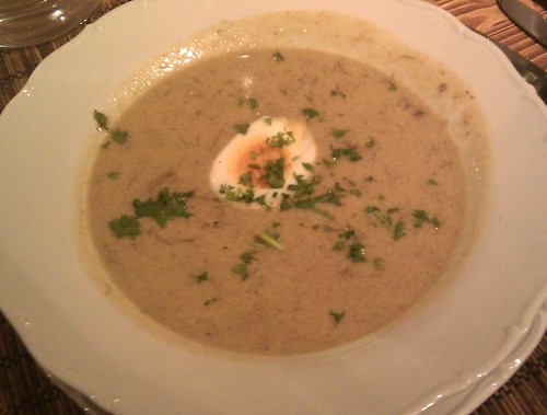 já - Měl jsem zájem co nejvíc jídel ochutnat, takže jsem zvolil polévku, předkrm, hlavní jídlo i zákusek, k tomu ještě dva domácí nápoje. U polévky jsem šel neomylně po kulajdě, byla výborná s půlkou vajíčka natvrdo, bramborami a celými kusy čerstvých hub. Jako předkrm jsem zvolil opečený chleba s pomazánkou z morku. Toto jídlo mne moc nenadchlo, byly to dva malé půlkrajíce chleba a morková pomazánka, která tedy byla spíš jen sádlem, takže ani trocha cibulky z něj neudělalo pecku. Za hlavní jídlo jsem si vybral konfitovaný pupek, který byl velmi vychválen v televizi. Přílohou byla pečená brambora s křenovým tvarohem, proti té nemůžu říct ani slovo, když pominu, že křen nepatří mezi má oblíbená jídla. Problém jsem měl bohužel s pupkem, který obsahoval větší množství koření, které mi moc nesedlo. Jinak bylo maso úplně dokonale měkké. Jako dezert jsem si dal borůvkový "koláč" z kysané smetany a piškotů. Složení se nápadně podobá dortu, který v rodině děláme, tak jsem byl zvědavý. Dezert byl podáván ve skleničce, což nemám rád, byl pokrytý šlehačkou, která ale již celkem spadla, takže byla málo vyšlehaná, nejspíš to bylo způsobené tím, že dezert skladovali hotový delší dobu v lednici. Dezert byl mírně těžší, než jsem zvyklý, ale byl dobrý, jen by se hodilo se vykašlat na šlehačku a dezert připravit den předem, aby byly piškoty trochu měkčí. U ostatních jsem ochutnal pečený čerstvý kraví sýr, který mne nijak nenadchnul, takový žvýkavý sýr. Kamarád si dal steak z kýty (200g) s cibulkou do zlatova, to bylo výborné jídlo a záviděl jsem mu. Kamarádka si dala steak ze svíčkové (200g) na liškách a s brusinkovou omáčkou, to bylo v pořádku, ale cibulka mi chutnala víc. První domácí nápoj byla Štěpánova bylinná limonáda, jednalo se o studený jemně perlivý nápoj s převážně medovou chutí, k nápoji jsme dostali skleničku s kostkami ledu. Druhým nápojem byl jeden z nabídky moštů, konkrétně třešňový mošt. Nedokázal jsem si takový nápoj přesně představit, čekal jsem lisovanou třešňovou šťávu, ale jednalo se o jablečný mošt s červeným zabarvením, kde jsem chuť třešní nepoznal.