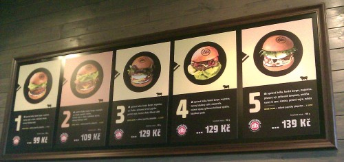 já - Nabídka burger baru je jednoduchá, tak se vešla na zalaminovaný jídelní lístek výšky papíru A4 a asi poloviční šířky. Tatáž nabídka visí velká na zdi, takže si můžete při konzumaci prvního hamburgeru krásně vybírat, který si dáte jako druhý.