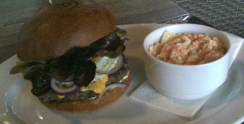 já - Ochutnal jsem smažená cibulová kolečka, coleslaw, Hamburger 2 a Hamburger 3. Cibulová kolečka žádná sláva, skoro neslaná, k tomu nějaká tatarka, nedoporučuji. Coleslaw v pohodě, ale ten z KFC je pořád o dost lepší. Hamburger 2 obsahuje housku, burger, majonézu, goudu, opečenou slaninu, čerstvé rajče a kolečka cibule, nakládanou okurku a hlávkový salát. Byl velmi dobrý, jen mi houska připadala sušší a tužší, než by to chtělo. Hamburger 3 obsahoval housku, burger, majonézu, cheddar, grilovanou papriku, pečené vejce, kolečka čerstvé cibule a dubový salát. Cheddar je do hamburgeru nejlepší, udělal housku mnohem šťavnatější. Vajíčko bylo dost intenzivní, takže celkem přebylo chuť masa, paprika se mi tam nehodila a rušila. Příště určitě budu trochu drzý a hamburger 2 si poručím bez okurky a goudy a místo toho si dám cheddar. Ve dvojce totiž chyběl cheddar a přebývala okurka a v trojce zase chyběla slanina a přebývala paprika.