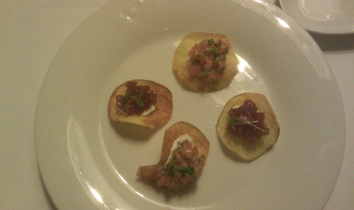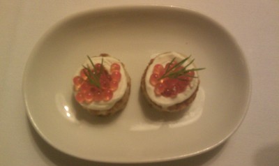 Prvním byly dva maličké lívanečky s jakýmsi krémem z kysané smetany, na tom byl kaviár a kousíček kopru. Kaviár byl zážitek, nikdy jsem jiný než ten ze skleničky za 30Kč neměl, tyhle kuličky byly hodně velké a celkově dobré.