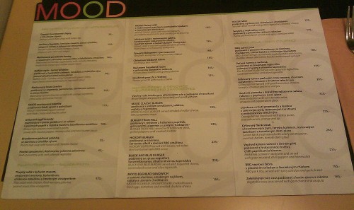já - Jídelní lístek byly papírové listy ve složkách v deskách s nějakým umělohmotným polstrováním. Listy uvnitř byly držené nějakým gumovým provázkem, takže nejdřív se první strany tvářily, že je budu muset držet, abych se koukal na další, ale pak už v úchytném systému něco přeskočilo a dalo se listovat normálně. Celkově dělal lístek trochu humpolácký dojem. A přestože bylo vše čitelné, byl lístek kvůli zbytečnému listování méně přehledný. Jedna zalaminovaná A4 by byla lepší.