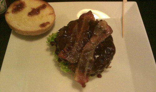 já - Původně jsem si chtěl dát něco z poledních menu, ale když jsem si všiml, že dělají hamburger, tak jsem si řekl, že ho taky srovnám. A udělal jsem moc dobře. Hamburger inzerují jako "XL domácí hamburger se slaninou, cheddarem, zeleninou a hranolky". Neřekl bych sice, že to byl nějak extra velký hamburger, porce byla spíš menší, tipnul bych 120-150g masa. Nicméně obsah byl úplně ukázkový: salát, burger, krásně osmažená slanina, plátky rajčete, plátky cibule, kyselá okurka (tu nemusím) a majonéza. Vše bylo v krásně do křupava rozpečené housce. Hranolky byly mírně podprůměrné, takové méně udělané, mám je rád hodně udělané. Už po hamburgeru samotném jsem byl pěkně najezený a porce hranolek mne pak zasytila úplně, že jsem si nedal ani dezert. Mimochodem dezert ani kávu se nám číšník nesnažil nabídnout nijak moc aktivně. Kdyby byl přinesl dezertní lístek a nabídnul mi nějaký domácí dezert, byl bych podlehnul.