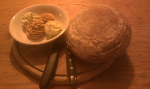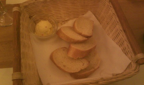 Druhým neočekávaným předkrmem byly kousky rozpečené bagety a asi tvaroh s pažitkou, byl krásně jemný a bagetky ještě teplé.