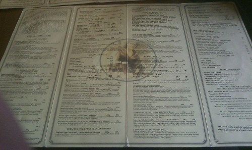 já - Už jsem říkal, že jídelní lístek mají laděný do staročesky vulgárního duchu, který mi není příjemný. Vybírat z kategorie "Masa kus pro bečkáře obžerný" mi opravdu není příjemné. Ale třeba to někoho baví. Samotné provedení jídelníčku se mi velmi líbilo. Jednalo se o velké kovové plato s papíry připevněné zboku do listovací podoby.
