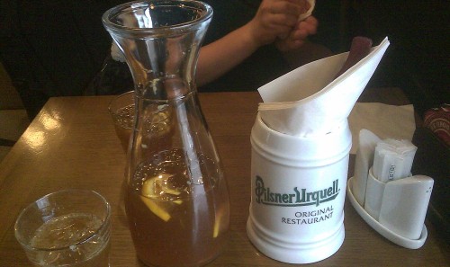 já - Lokály existují tři, my jsme byli v Lokálu v Dlouhé ulici mezi náměstím Republiky a Staromákem. Podnik je óooobrovský, snad 60m dlouhý. U vstupu je asi pět stolů rezervovaných pro štamgasty a celý zbytek je pro běžné návštěvníky. Přišli jsme v 12:30 a podniky byl úplně plný obědvajícími.