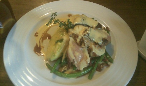 já - Přišel jsem ne moc hladový, tak jsem šel rovnou na hlavní jídlo. Dal jsem si čtvrt kachny. K ní jsem si s kamarádkou napůl dal karafu citronády, kterou jsem objednal omylem místo vody s citronem (20Kč rozdíl). A nějak tu citronádu nedokážu přesně identifikovat, měla tmavou jakoby čajovou barvu, ale chuť časová nebyla, byla dost nevýrazná. Nicméně nápoje bylo dost a za dobrou cenu. Kamarádka si dala panenku na fazolkách se slaninou, ochutnal jsem jen sousto a trochu mne tam rušila přítomnost česneku, jehož několik plátků bylo na talíři.