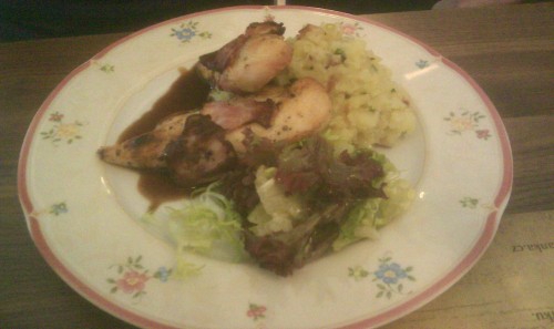já - Restaurace má některé své části dost rozporuplné, mezi hlavní patří právě jídelní lístek, který se dělí na stálý, denní a jakýsi akční. Prezentaci jídelního lístku na internetu se budu věnovat úplně nakonec. Stálý jídelní lístek má pevné voskové desky a uvnitř jsou přehledné potisknuté nažloutlé papíry. Denní nabídka je na bílém papíru volně vložena do desek. Celé desky mají chytrý posouvací hřbet, takže je v případě potřeby možné obsah nabídky jednoduše změnit výměnou některého z listů. Akční nabídka je vytisknutá ve stylu restaurace na papíře, který leží uprostřed stolu. Z akční nabídky jsem si vybral flammkuchen s cibulí a slaninou, ale bylo mi sděleno, že věci z této nabídky už nemají. Tak proč teda tenhle papír na stole mají?