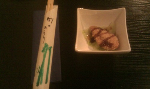 já - Hned po usazení jsme dostali mističku se smaženým nuggetem nějaké ryby. Byla to taková jednohubka, dobrá.