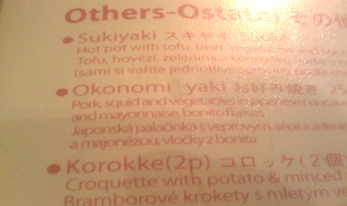 já - Jídelní lístek byl v tvrdých deskách a listy A4 vloženými v pevných igelitových stránkách. Lístek obsahuje český, anglický i japonský popis, což znamená opravdu hodně textu, takže je jídelák opravdu rozsáhlý, asi 12 listů. Jídelní lístek byl celkově laděn do růžova a to včetně textů. Font byl taky nějaký roztažený do šířky, takže se četl dost nepohodlně. Uprostřed stránky byl růžový pruh, o němž jsem si myslel, že odděluje jednotlivé druhy jídel, ale až ke konci jsem si všiml, že se naopak jedná o nadpis jídel na dané stránce, opravdu matoucí. Číšník při doporučování v jídeláku trochu tápal se slovy, že je jídelák nový. Pak mi tedy ale není jasné, proč mají některá místa přelepená nálepkami "Vyprodáno", někde mají nálepku s akcí a jinde mají překlep opravený bělítkem. Co to do prčic je? Vytisknutí nových stránek může pro všechny jídeláky vyjít na maximálně několik set korun, tak proč to sakra neudělají. A ještě jsem narazil na popis, který jsem nepochopil "3 nigiri + 1 rýžová rolka (6ks)". Buď neumím počítat, nebo je chyba někde na jejich straně.