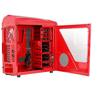 Velká červená skříň vybraná zákazníkem. Na čelním panelu má dva USB 3.0 konektory a standardní audio konektory (sluchátka a mikrofon).