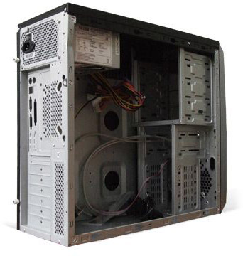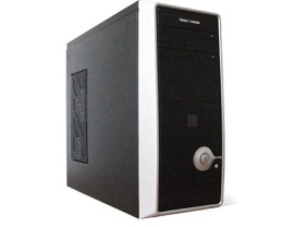Levná skříň s 350W zdrojem. Na čelním panelu jsou vyvedeny 2 konektory USB a audio konektory (sluchátka a mikrofon).