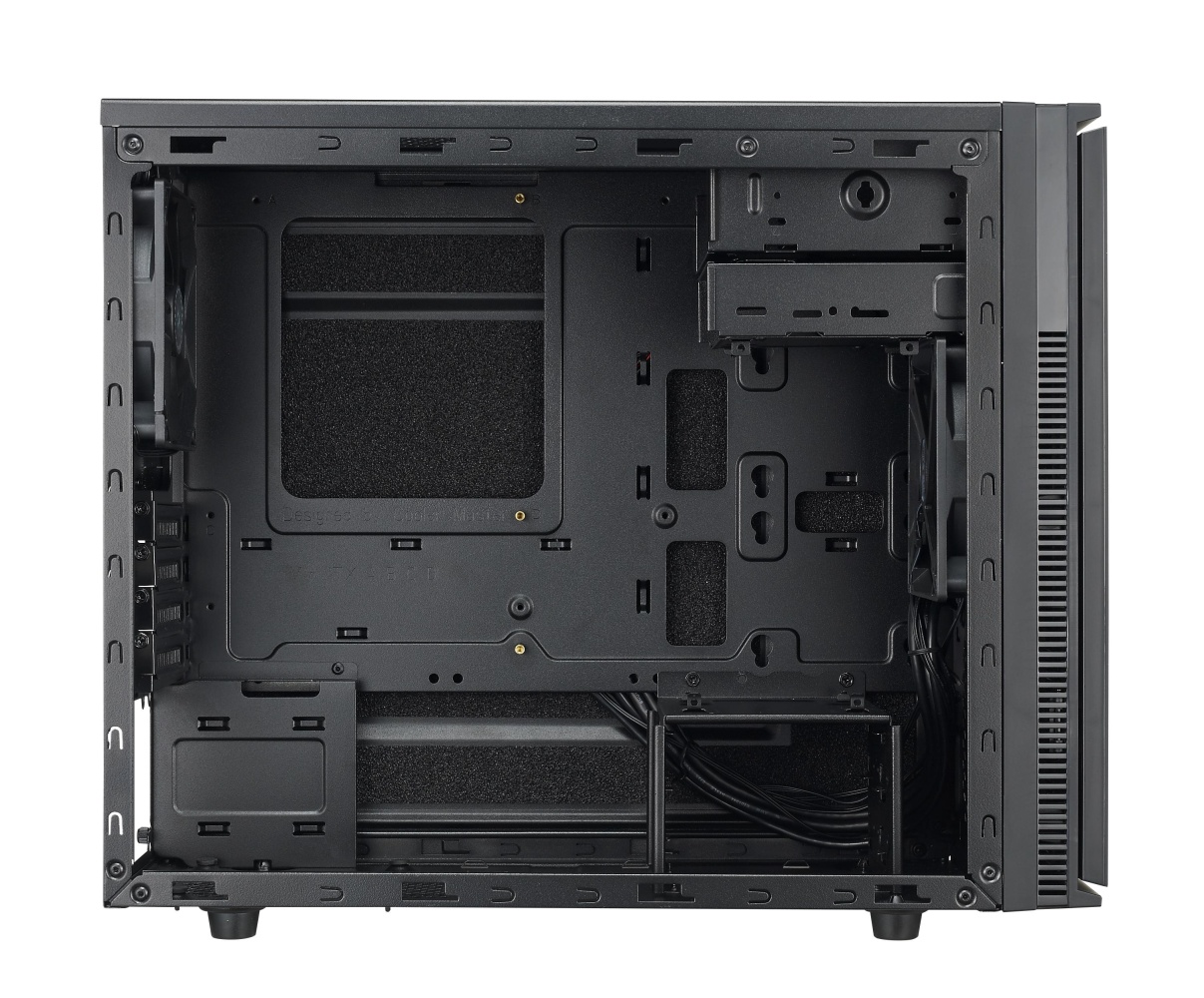 Odhlučněná mATX skříň dodávaná s dvěma 120mm ventilátory pro dobrý průtok vzduchu skříní. Na čelním panelu je vyveden jeden konektor USB 2.0, dva USB3.0, audio konektory (sluchátka a mikrofon) a čtečka SD karet.