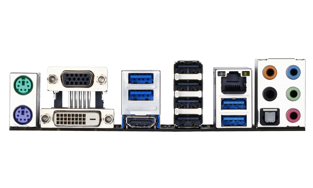 Základní deska vyvádí dozadu počítače tyto konektory: 4x USB 2.0, 4x, USB 3.0, 2x PS/2, 1x Gbit síť, optický výstup a Jack výstupy pro až 7.1 reproduktory, výstupy integrované grafiky (HDMI, DVI, D-SUB)