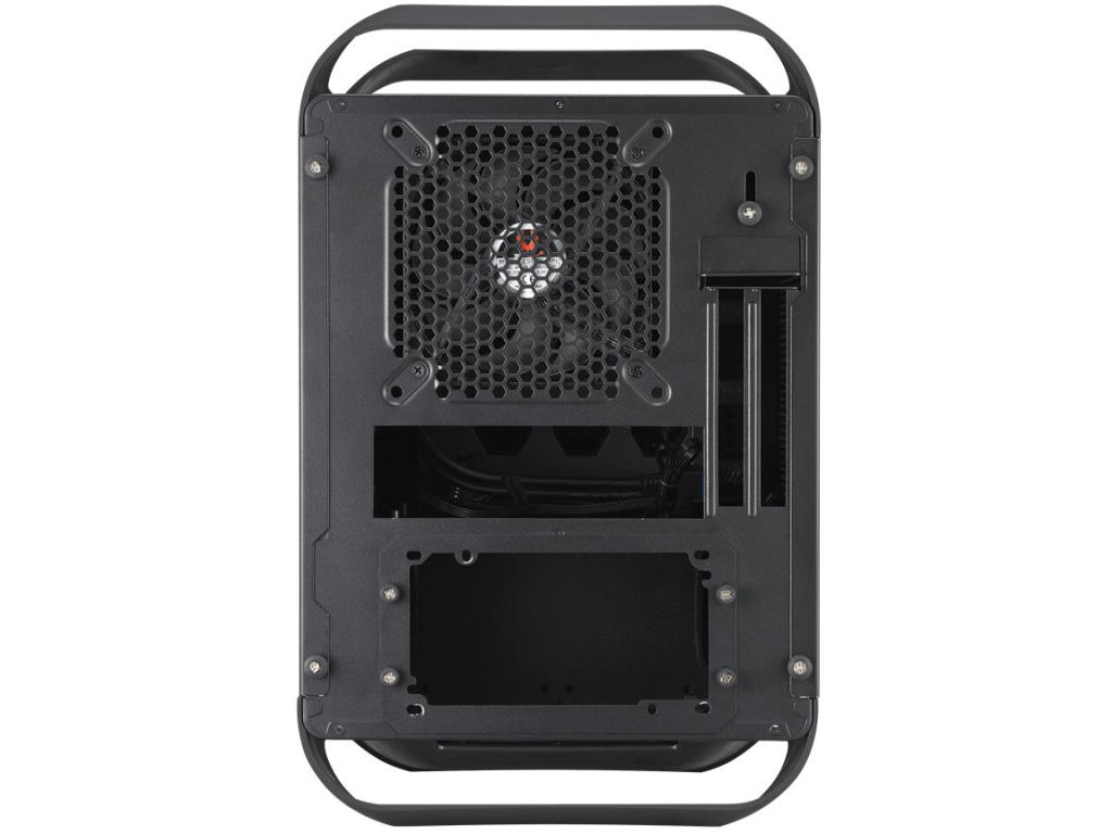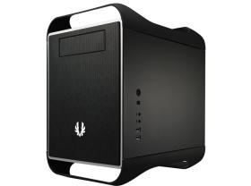 Počítačová skříň formátu mini ITX. Na pravé bočnici jsou vyvedeny 2 konektory USB 3.0 a audio konektory (sluchátka a mikrofon).