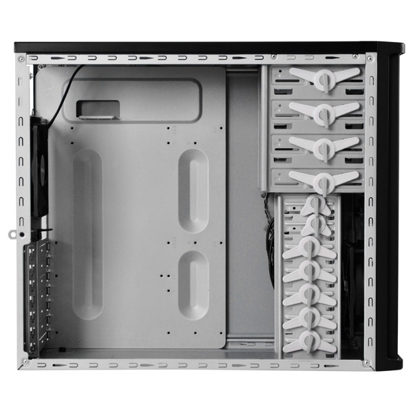 Dodává se se 120mm ventilátorem pro průtok vzduchu skříní. Na spodním panelu jsou dva konektory USB 2.0 a audio konektory (sluchátka a mikrofon).