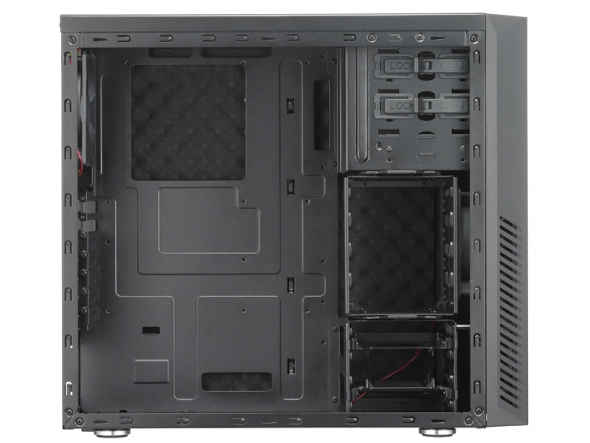 Skříň je speciálně vybavena pro snížení hluku. Dodává se se 120mm předním nasávacím a zadním vyfukovacím ventilátorem. Na čelním panelu je vyveden jeden konektor USB 2.0, jeden USB3.0, audio konektory (sluchátka a mikrofon) a čtečka SD karet.